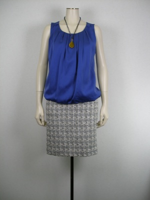 マットな光沢感のブラウスとツイードスカートの異素材コンビ。二つをあえて合わせる事でワンピース風の着こなしを楽しめます!エレガント度80%、スタイリッシュ度20%。
