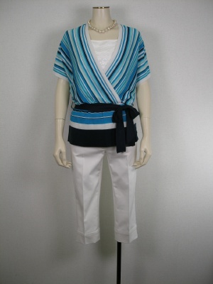 ブルー系ストラップが夏らしいカシュクールニット。白を合わせると、色が引き立ちます。パールのアクセでエレガントなカジュアルに!エレガンス度60%、スタイリッシュ度40%、