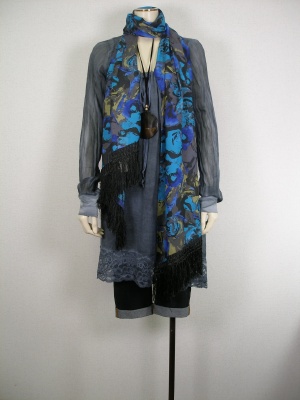 ムラ染めのエスニックなワンピースに、フリンジ付きのストールでミステリアスな雰囲気。レギンスで少しだけカジュアルにハズして!エレガンス度60%、スタイリッシュ度40%。