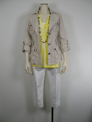サファリジャケットをあえて淡い色でコーディネートしてみました。ハードなイメージが和らぎ、爽やかな印象です!スタイリッシュ度90%、アクティブ度10%。