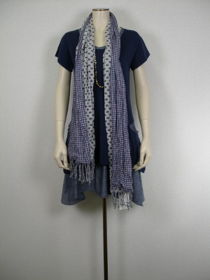 スカート部分が取り外せる個性的なワンピース。ストールも同系色のネイビーでまとめてスッキリと。涼しげでナチュラルな可愛さです!フェミニン度60%、アクティブ度40%。