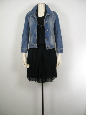 大ぶりのビーズ使いがエレガントなワンピースにあえてGジャンをオン。このギャップがお洒落です。Gジャンは必ずコンパクトサイズを選んでくださいね!エレガント度70%、スタイリッシュ度30%。