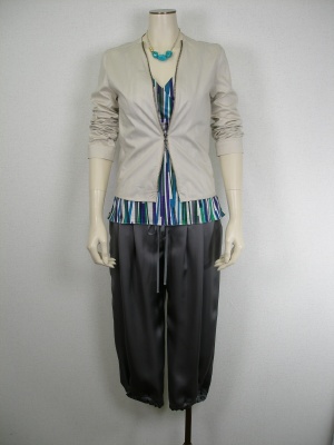 ゆったりしたパンツは上品な光沢と落ち感が大人っぽい。ジャケットを合わせれば通勤にもオススメです!スタイリッシュ度90%、エレガンス度10%。