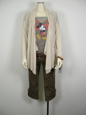 ミッキープリントのTシャツは、ユーズドっぽさが魅力。ドレープカーデと綺麗目カーゴで大人のカジュアルに!スタイリッシュ度60%、アクティブ度40%。