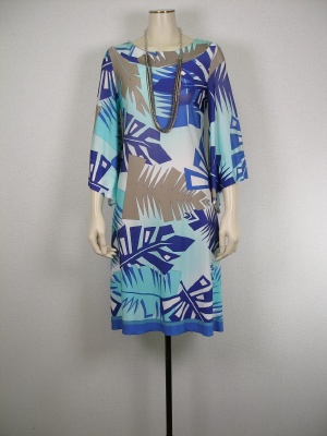 真夏なイメージのリーフ柄ワンピースでお出かけしたいですね。ラクでシワにならないジャージ素材なので 旅行にもピッタリ!エレガンス度70%、スタイリッシュ度30%。