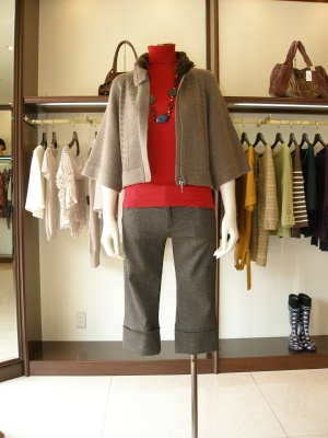 クリアな赤はブラウンと合わせると、やさしい表情に!フェミニン度90%、エレガンス度10%。