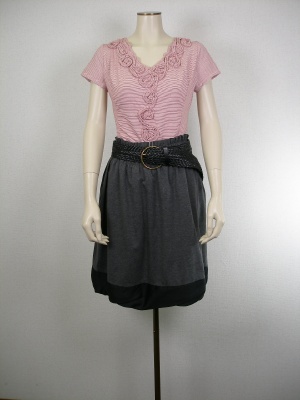 Tシャツとジャージスカートの楽チンなコーディネートですが、ワザありデザインでオシャレに。お友達とのランチにも良いですね!フェミニン度90%、アクティブ度10%。