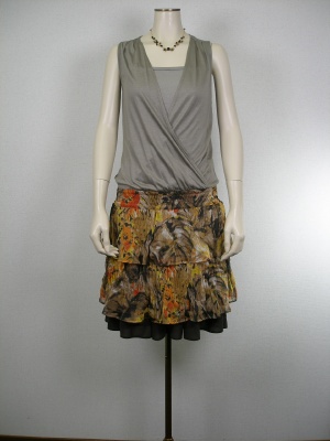 ティアードワンピースをもう一段フレアスカートを合わせて調整。柄のオレンジ系が夏を感じさせるフェミニンテースト!フェミニン度80%、スタイリッシュ度20%。