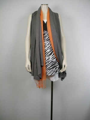 チュニックやロングジレなど、長め丈に合わせるならショート丈が今年のバランス。ゼボラ柄とオレンジのストールがサファリなアクセントに!スタイリッシュ度80%、アクティブ度20%。