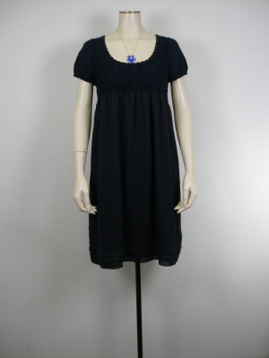胸の部分が透かし網になったヨーク切りかえの甘いワンピース。紺色でとても清楚なデザインは夏のお出かけの装いにぴったりですね!フェミニン度100%。