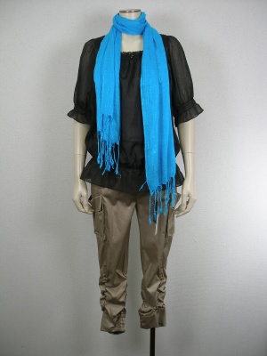 カーゴサルエルは流行。夏にこげ茶を持ってくると暑い日差しにとてもよく映えますね。ターコイズのストールがポイントです!スタイリッシュ度80%、アクティブ度20%。