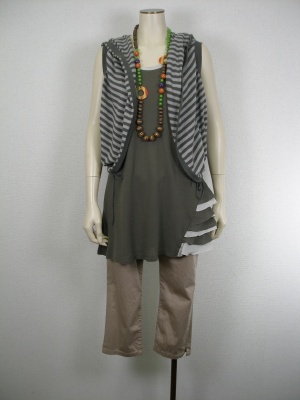 裾にポイントがある長めのカットソーには、ショート丈ジレを合わせて。ナチュラルカレーで作るマリンスタイルです!アクティブ度100%。