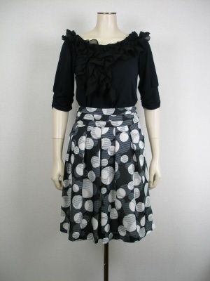 ボリュームたっぷりのフリルもモノトーンでまとめれば甘すぎません。すっきりしたシルエットのシフォンスカートでバランスよくまとめて!エレガンス度90%、フェミニン度10%。