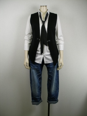 ボーイフレンドデニムをネクタイ付きシャツとジレでハンサムに着こなして!スタイリッシュ度70%、アクティブ度30%。