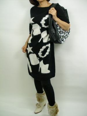 80’s風のポップな柄のニットワンピ。足元はボリュームのあるブーツやレギンス。カラータイツなどで思いっきり遊びたい!スタイリッシュ度60%、アクティブ度40%。