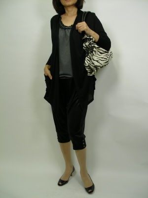 サルエルパンツとロングカーデで全体をゆるめな着こなし。少しだけタイトな部分があればだらしなくなりません!スタイリッシュ度80%、アクティブ度20%。