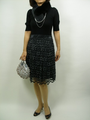 ニットとコンビの上品なワンピース。ディナーや目上の人と会う時などにも良いですね!エレガンス度90%、フェミニン度10%。