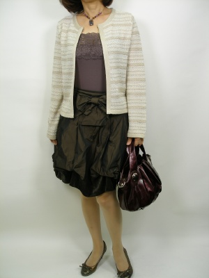 バルーン型のスカートはふんわりボリュームが出ますが、上をコンパクトに抑えると上品な甘さが出ますね!フェミニン度90%、エレガンス度10%。