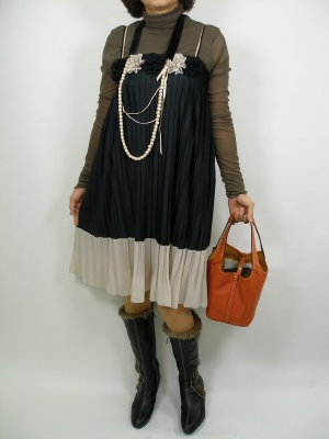 胸元のお花モーチーフがカワイイプリーツワンピース。インナーのタートルをメッシュ素材にすれば少しエレガントに!フェミニン度70%、エレガンス度30%。