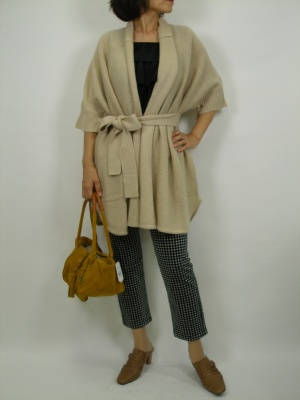 素材で暖かそうなニットのインナーにはあえて薄いブラウスを合わせてみて。異素材の組み合わせがオシャレに見せるコツです!アクティブ度70%、スタイリッシュ度30%。