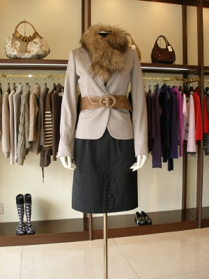 定番のきちんとスタイルにファーとベルトで華やかさが加わります!エレガンス度70%、スタイリッシュ度30%。