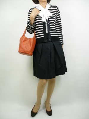ボーダーカーデェのインナーをボータイブラウスにしたら、清楚なマリルスタイルに!フェミニン度90%、アクティブ度10%。
