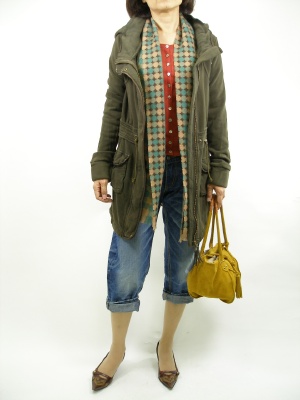 秋らしいオレンジ色のカーデをインナーとして。コートが暗い色ならインナーや小物は色をたくさん使ってもOK!アクティブ度100%。