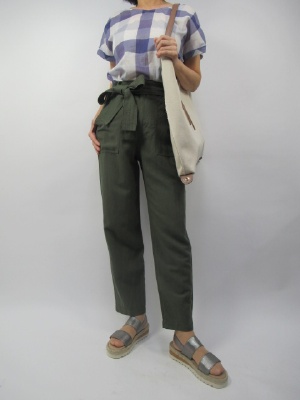 涼しげなシャツブラウスは大き目なギンガムチェック柄で下はカーキのベイカーパンツ。麻混の涼しげなパンツなので、これからの季節重宝しますね!