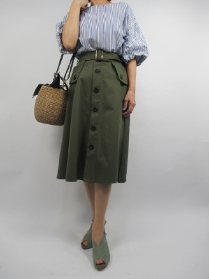 袖に刺繍をあしらったふんわかブラウス。ブルーのお色にはカーキがよくなじむ。ストライプ柄で涼しげなブラウスはロング丈のSKにも良く合いますが今回はトレンチスカートでコンサバスタイルにまとめました!