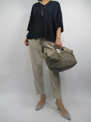 腰にゆとりを持たせたティーパードパンツはトップスの丈を短めに。そして少しボリュームのあるゆるっとしたデザインが良く合います。ベージュ×ネイビーでシンプルコーデ!