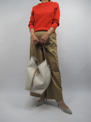 バギーのワイドパンツにオレンジのカットソーをチョイス。カーキに良く合うオレンジ色は夏の日差しにぴったりマッチ。まだまだ夏のお出かけにも間に合う一枚です!