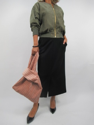 カットソー地のタイトスカートは前スリットの大人っぽい一枚。トップスはブルゾンでややカジュアル感のあるものをチョイスしてシャープな印象に。カーキ色にピンクのバッグがポイントになります!