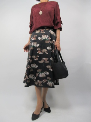 花柄の大きなプリントもベースが黒いと落ち着いた印象になる。流行のボルドーカラーをトップスに秋色をイメージしました!
