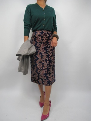 地厚なしっかりした生地が出るのであまり体のラインを拾わないのでタイトスカートでもキレイに着こなせる。ブルー系にトップスのグリーンがよくマッチしてシックな秋コーデになる!