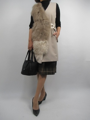 シンプルな黒のニットに合わせたチェック柄のスカート。パープルとゴールドの柄の組み合わせが子供っぽくならない。ラム系でさらに大人っぽいイメージに。ファーのジレをアクセントに!