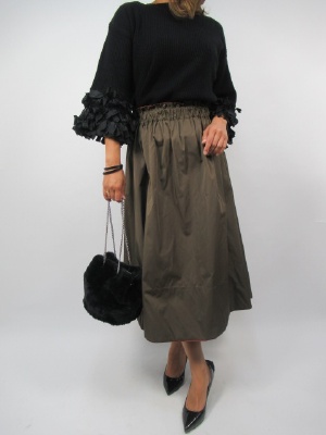 シンプルなデザインですが袖口にリボンでアクセントをつけてキュートなボリュームを持たせたニット。シックな黒なのでスカートをカーキにしてトーンを黒ベースにしました。全体にキュートなシルエットなので重たくなくかわいく仕上げました!