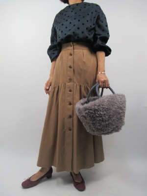 秋一番今までのイメージががらりと変わる。そんなアイテムをコーディネートに取り入れたい。ふんわりフレアなスカート。前ボタンがポイントになってかわいさもあるけれどもスエードのような生地が大人っぽさを演出。おなか回りはすっきりしたデザインなのでトップスはお袖がふんわりしたものでバランスをとりました!
