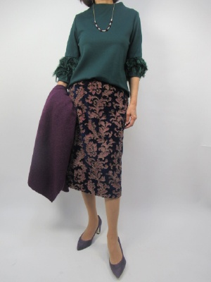生地は別珍のようなマットな表面に立体的な花の模様をデザインしたとてもシックで上品なタイトスカート。。それにグリーンの袖ぼりゅーむブラウスを合わせて寄り華やかさを強調する。秋の食事会やランチタイムにちょっとおしゃれを楽しんで!