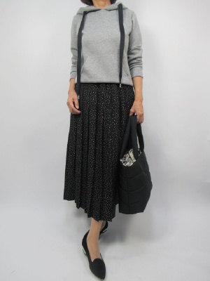 地味色のミモレ丈のプリーツスカートはフェミニンなトップスよりスポーティーなパーカを合わせた方が今年っぽくなる。パーカのところから流れる黒のリボンがスカートの黒とリンクしてつながるコーデ!