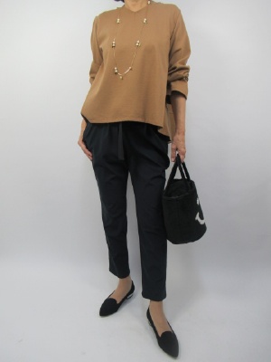 テント型のシルエットで後ろにボリュームを持たせたカットソーブラウス。ヒップラインで程良く収まるのでテーパードパンツとの相性がよく甘さのあるフェミニンコーデ!