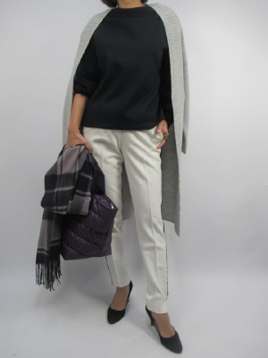 すっぽり体を隠してくれるニットも上質なふんわりコーデガンだと大人っぽくオシャレになる。ボトムスをあえてライン入りのトレンドを加えたホワイトパンツをチョイスして気負わない自然体オシャレコーデです!