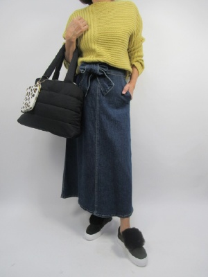 横編みのザックリニットは一枚でデイリーファッションがぐっと格上げされる。マキシ丈のデニムスカートで女らしく足元は軽めのスリッポンがいい!