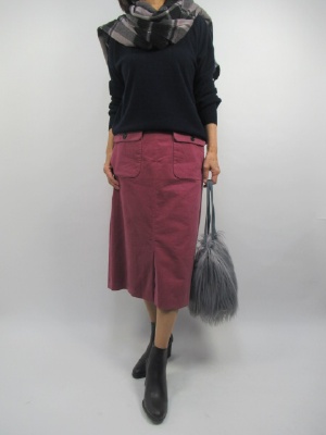 ピンク紫の優しい色がおしゃれなスカートです。少しAラインになってはきやすいデザインです。トップスにネイビーのニットを合わせて大人可愛いコーデにしてみました。グレー系の小物とブーツの茶色がピンクに良くマッチした冬のコーデです!