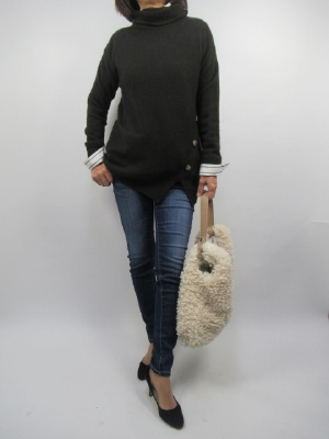 シャツとニットを合わせるコーデ。今季は長めのものをチョイスすると間違いなし。インナーのシャツがちらっと見えるようにニットの左側にスリットが入っている。細身のパンツで合わせてみて!
