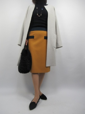 リブタートルニットはノーカラーのコートが良く似合う。さらっとニット+台形スカートで大人可愛く。色はネイビー+黄色にアクセントとしてグレー系のコートをチョイスしてみました!
