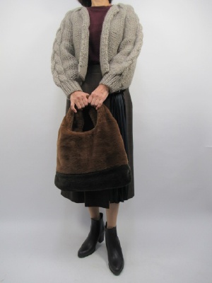 変形スカートはカジュアルにザックリカーデが良く似合う。色のトーンを合わせてデイリーの装いにしてみました。モカ系のナチュラルな色は大人のカジュアルにピッタリ合う色目です!