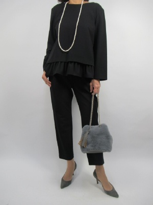 スカートやワンピースが苦手な人に綺麗目なエレガントパンツスーツはいかがでしょう。ティアードの裾がちょっとフェミニンな要素を漂わせるパンツははきやすいテーパード型。ロングのパールでコーデすれば卒入のオケージョンにも使えるセットアップです!