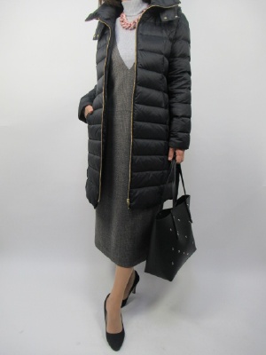 膝して丈のジャンスカに合わせる上のアウターはひざ上の長さのダウンコートがベストバランス。ダーク系の色にネイビーのそれもちょっと濃い目のネイビーが良く合う!