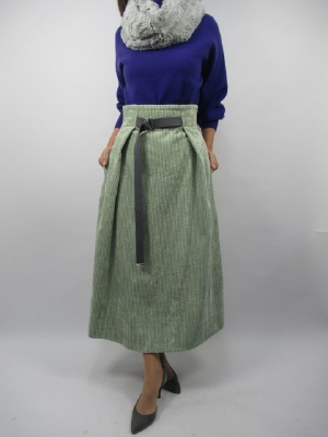 淡いグリーンのコーデュロイスカート。優しい色には綺麗な色のニットがよく似合う。ウエストを強調したスカートですがAラインのフェミニン要素たっぷりですが大人っぽさも感じられる雰囲気のあるスカートコーデ!