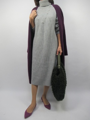 タートルでストンとしたニットワンピースはメリハリがないのでロングのニットカーデでバランスを取ってみました。グレー×パープルの色も手伝ってとてもオシャレなお出かけファッションです!